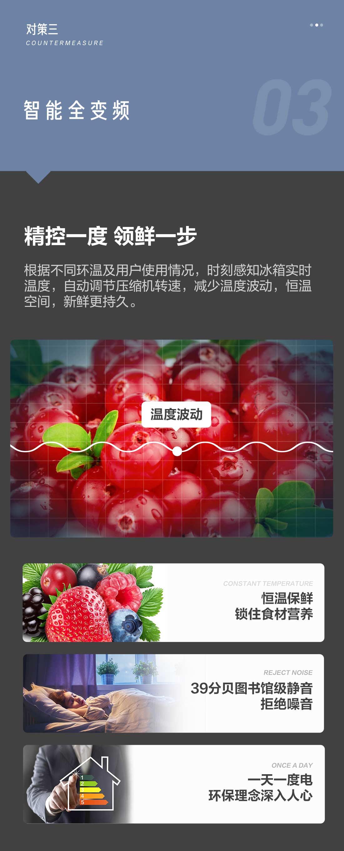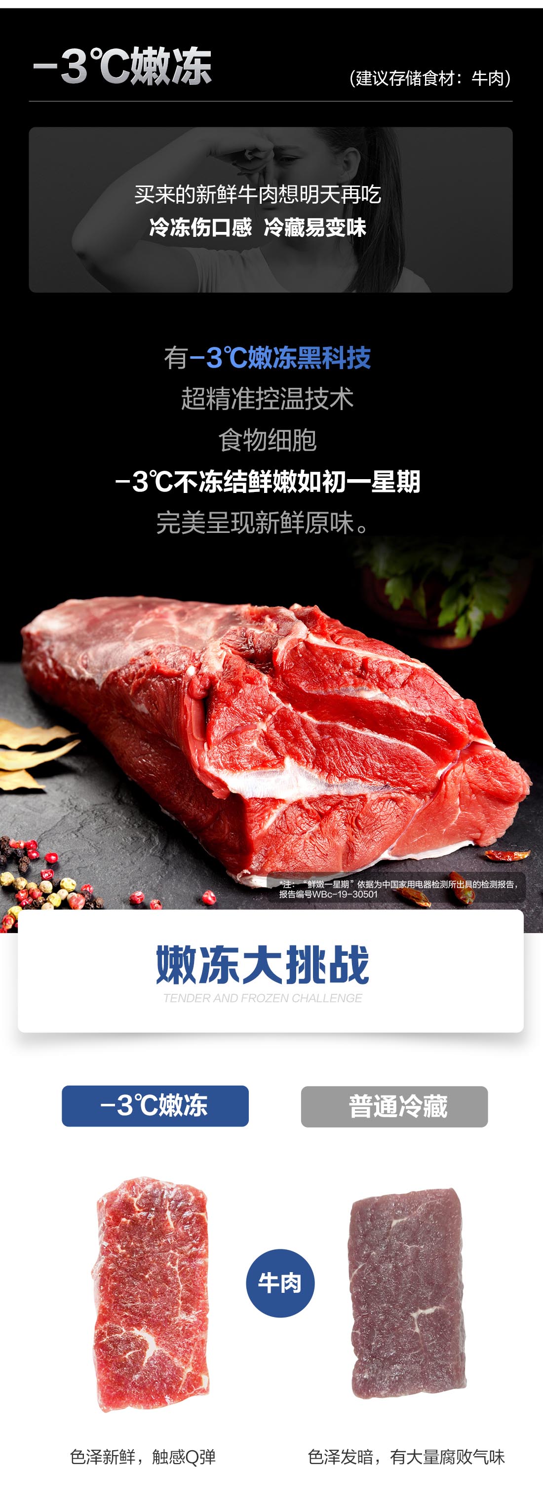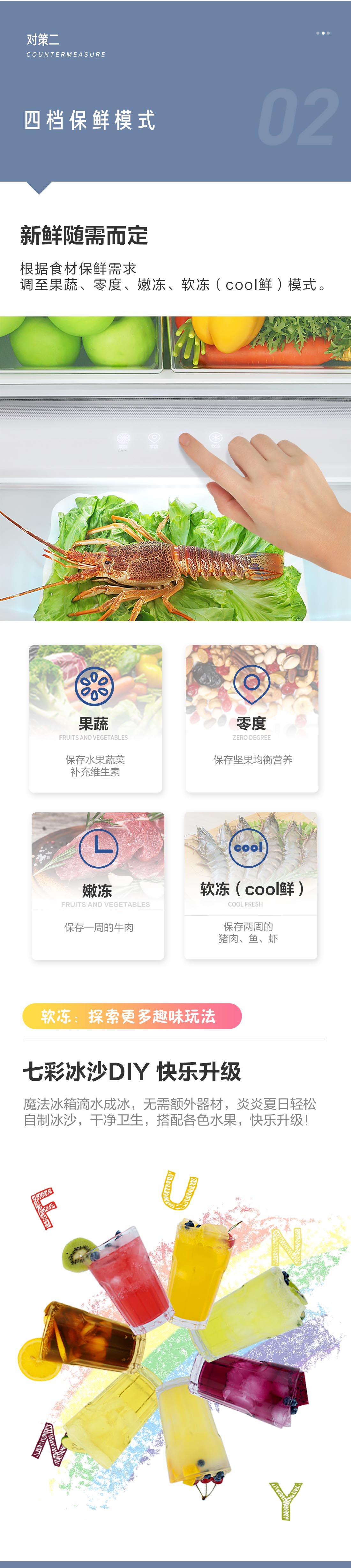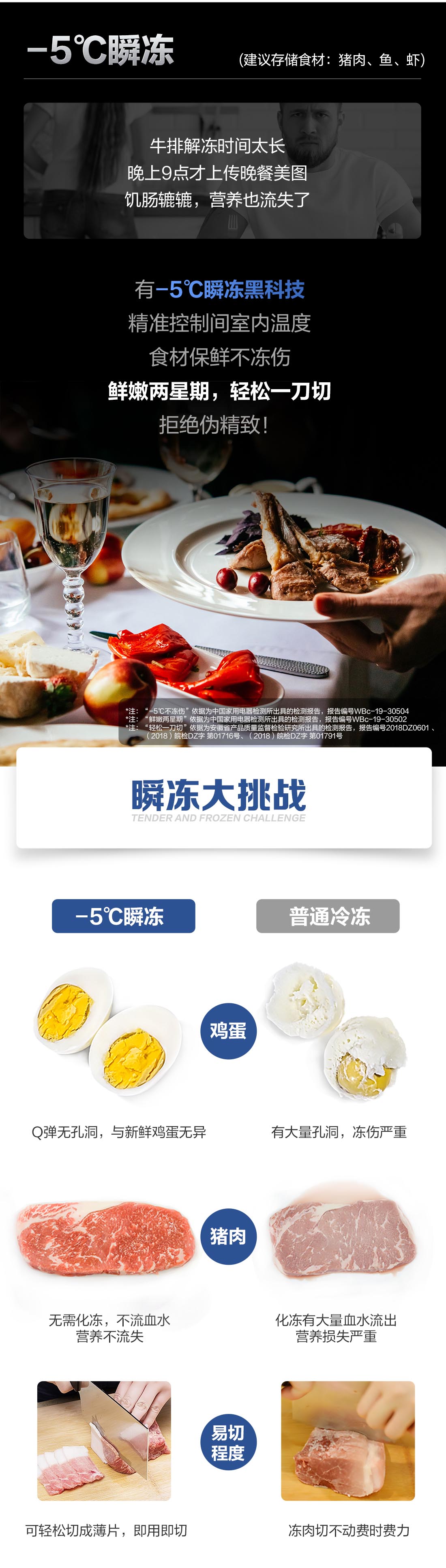 搭載-5℃瞬凍黑科技,鮮嫩兩星期,輕松一刀切。細(xì)胞級(jí)養(yǎng)鮮,營(yíng)養(yǎng)流失少。搭載-3℃嫩凍黑科技,食材不結(jié)冰,鮮嫩一整周。智能全變頻技術(shù),恒溫保鮮,節(jié)能靜音。