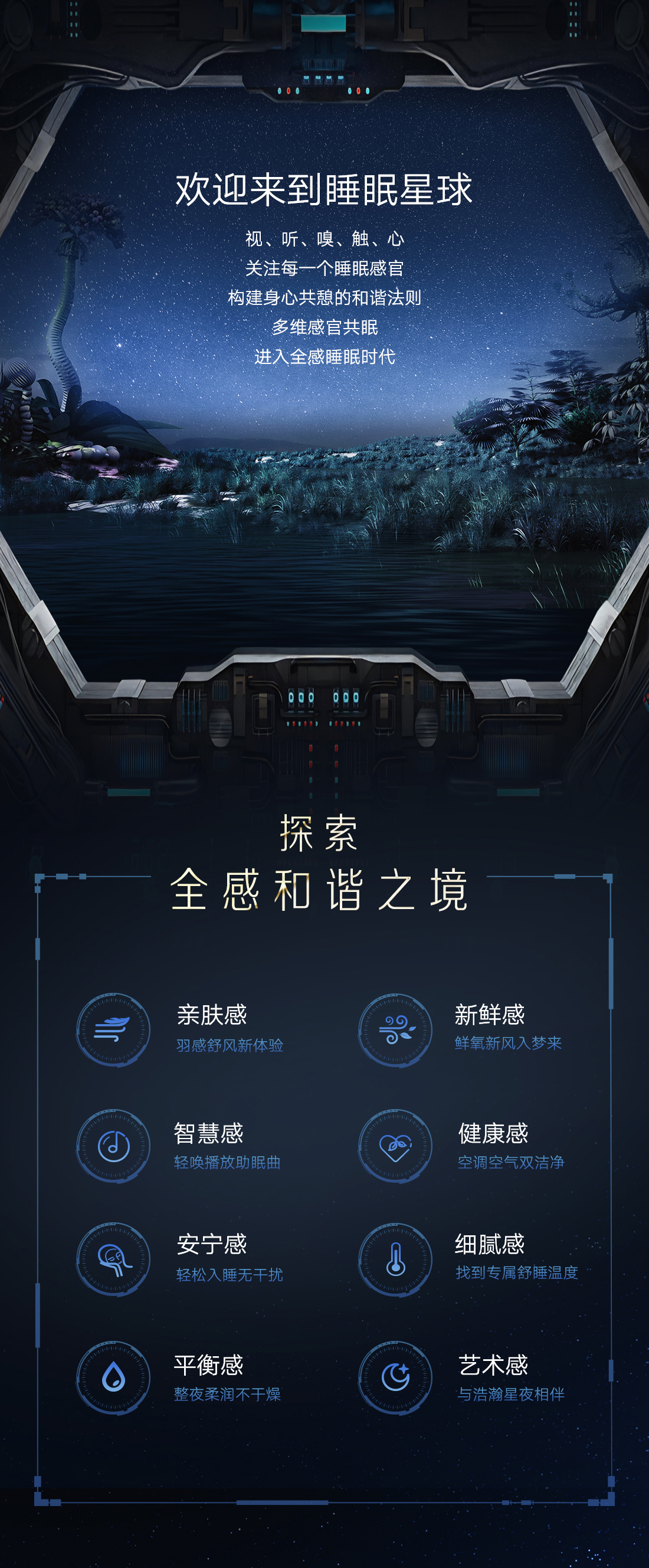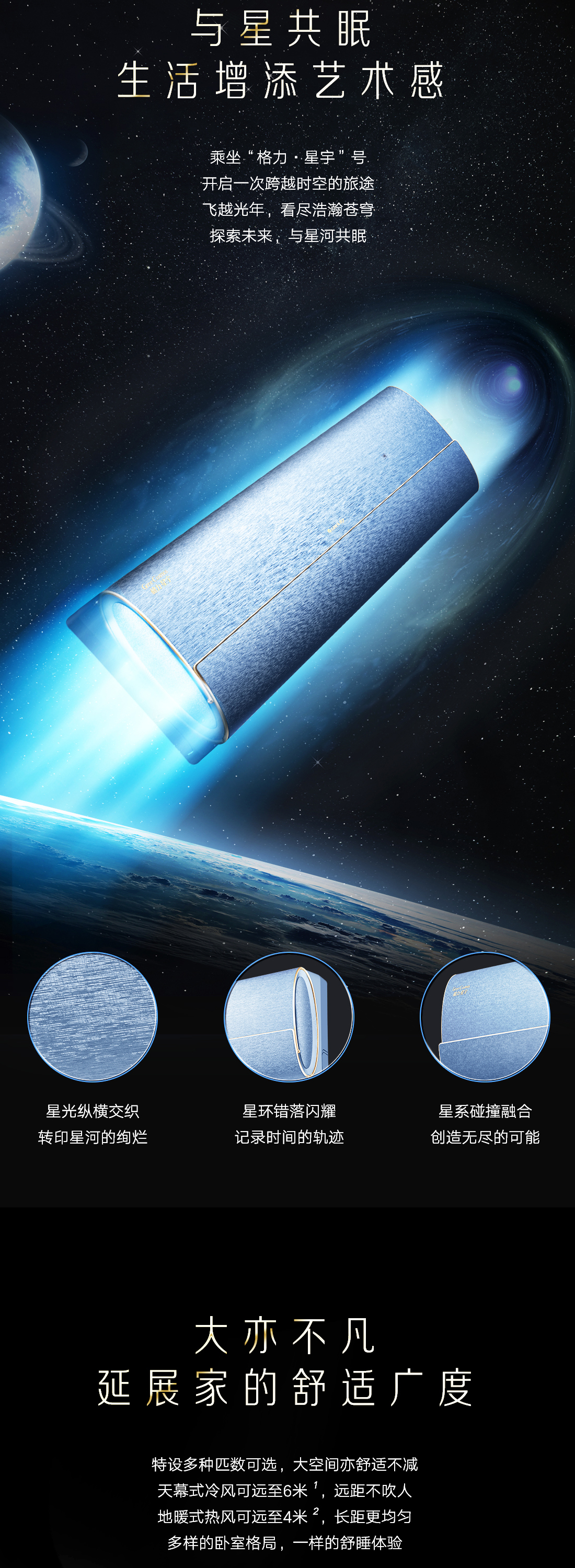 歡迎來到睡眠星球!格力睡眠空調“星”升級,格力·星宇空調關注視、聽、嗅、觸、心每一個睡眠感官,構建身心共憩的全感和諧之境。
